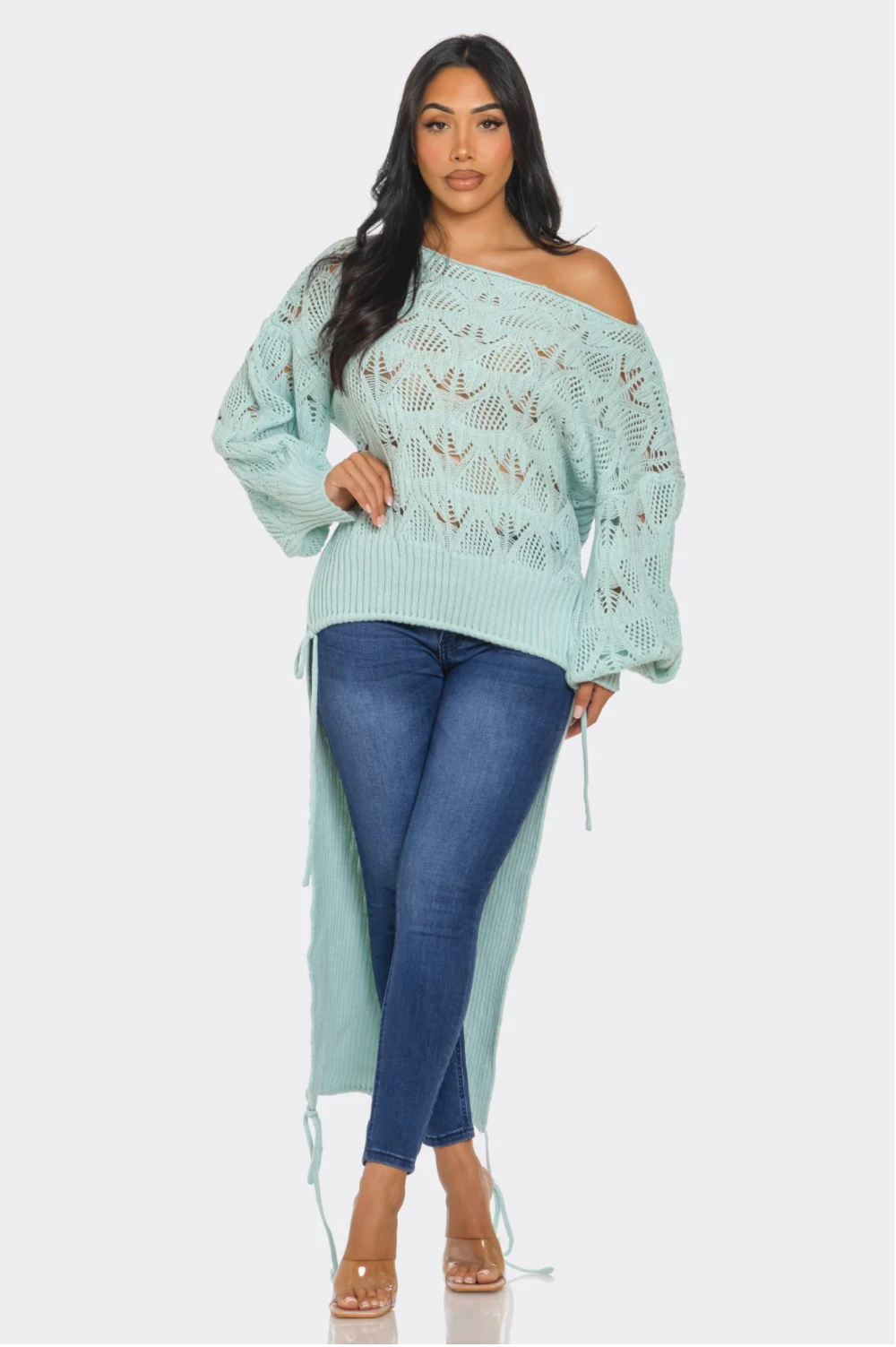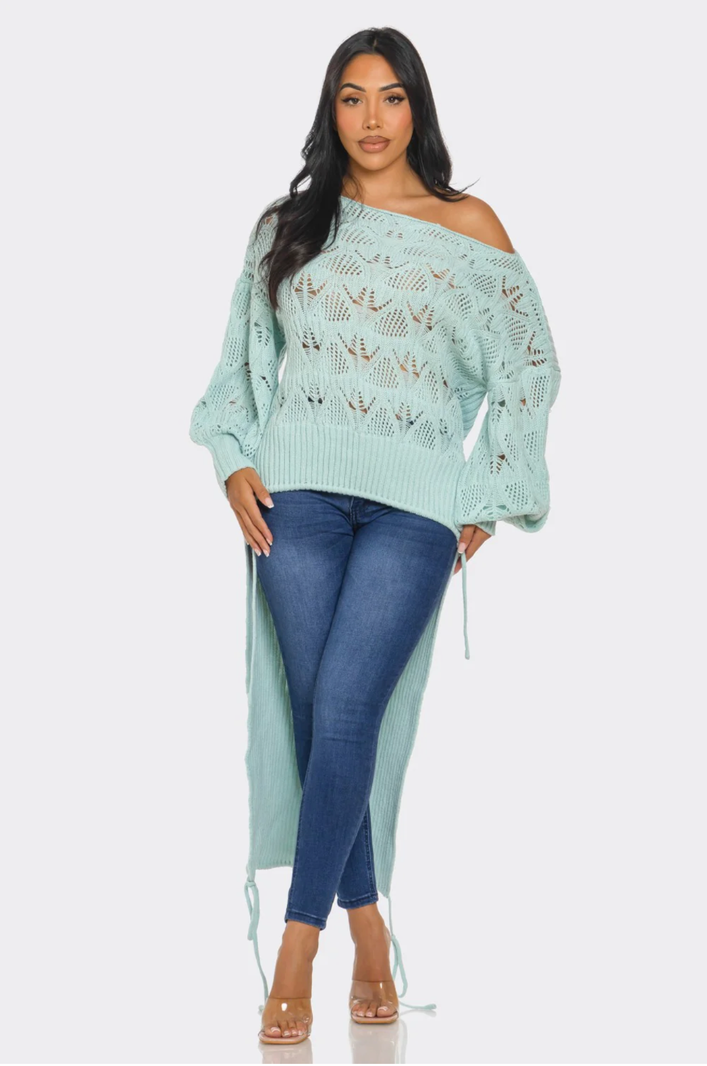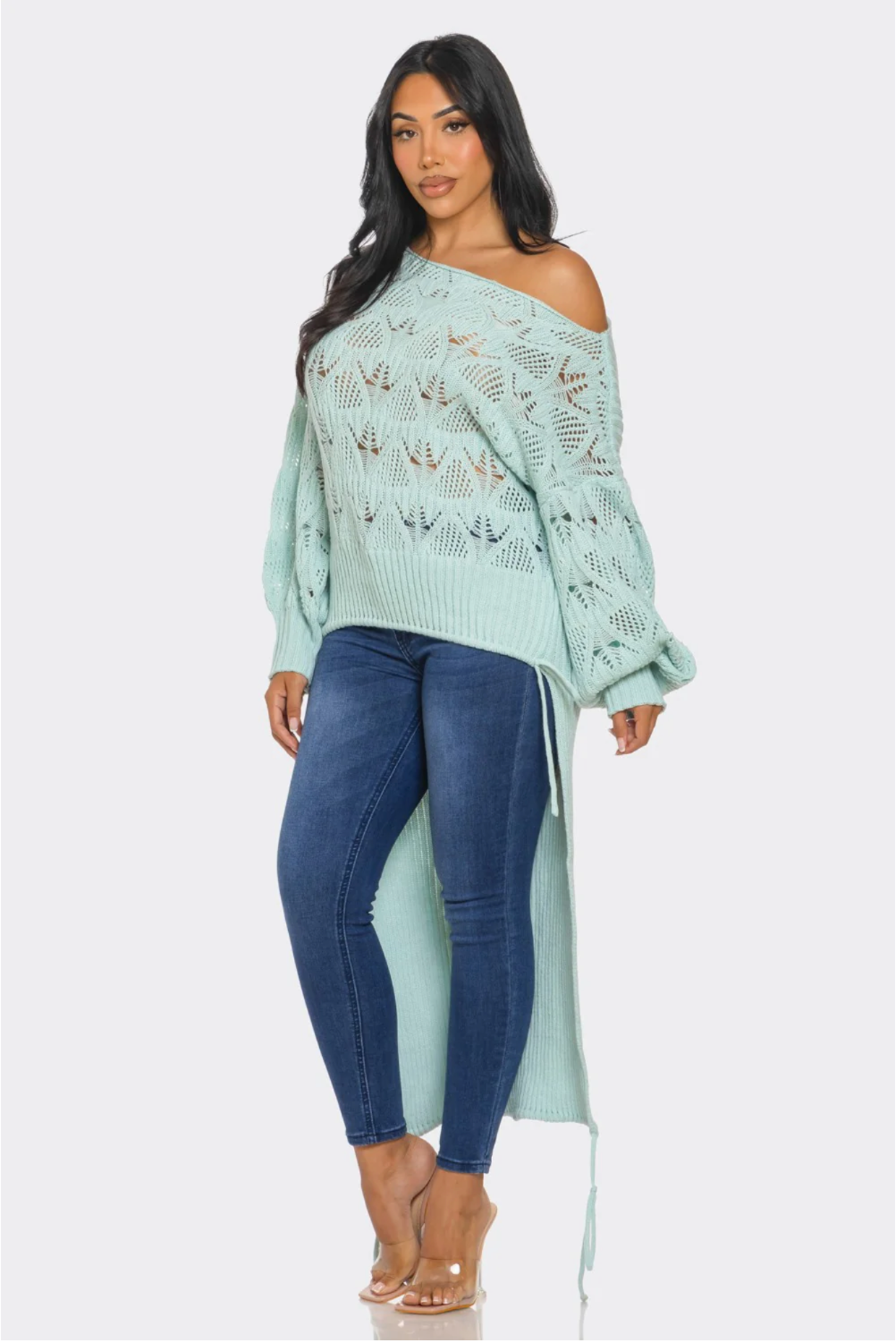 This cozy oversized knit sweater features a delicate open-knit pattern with an asymmetrical hem that drapes effortlessly on the body. The sweater has a one-shoulder neckline, adding a modern, sultry twist to this classic piece. The balloon sleeves and long side panels enhance the relaxed fit, making it a versatile piece that can be paired with both casual jeans and dressier bottoms.