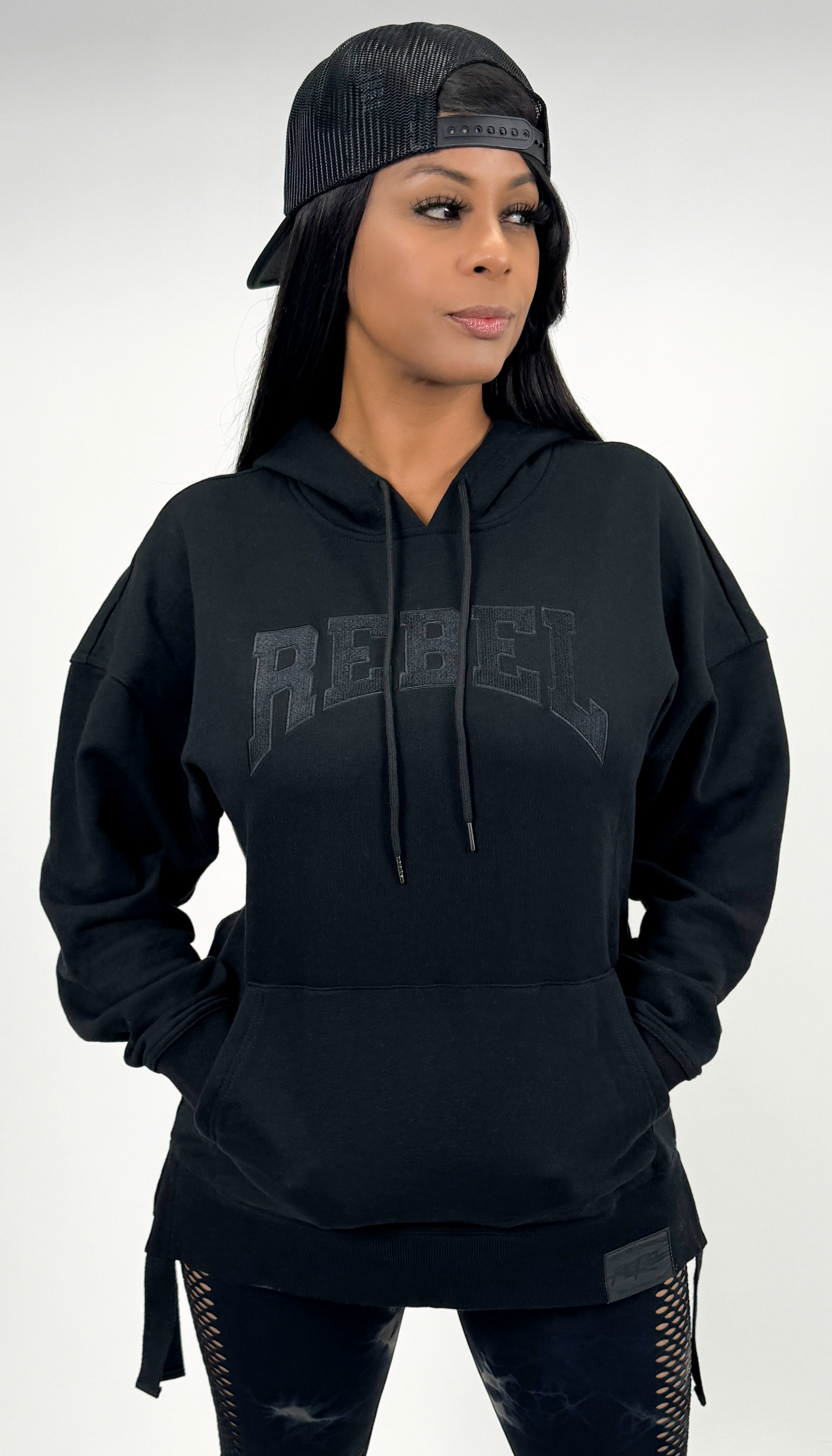 Elevate your look with our women's sexy black/black Rebel hoodie, where edgy meets elegance. Embroidered lettering to match your fearless heart, crafted from luxurious french terry cotton for comfort that caresses your curves. Dare to be bolder.