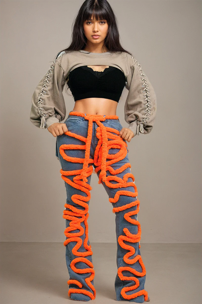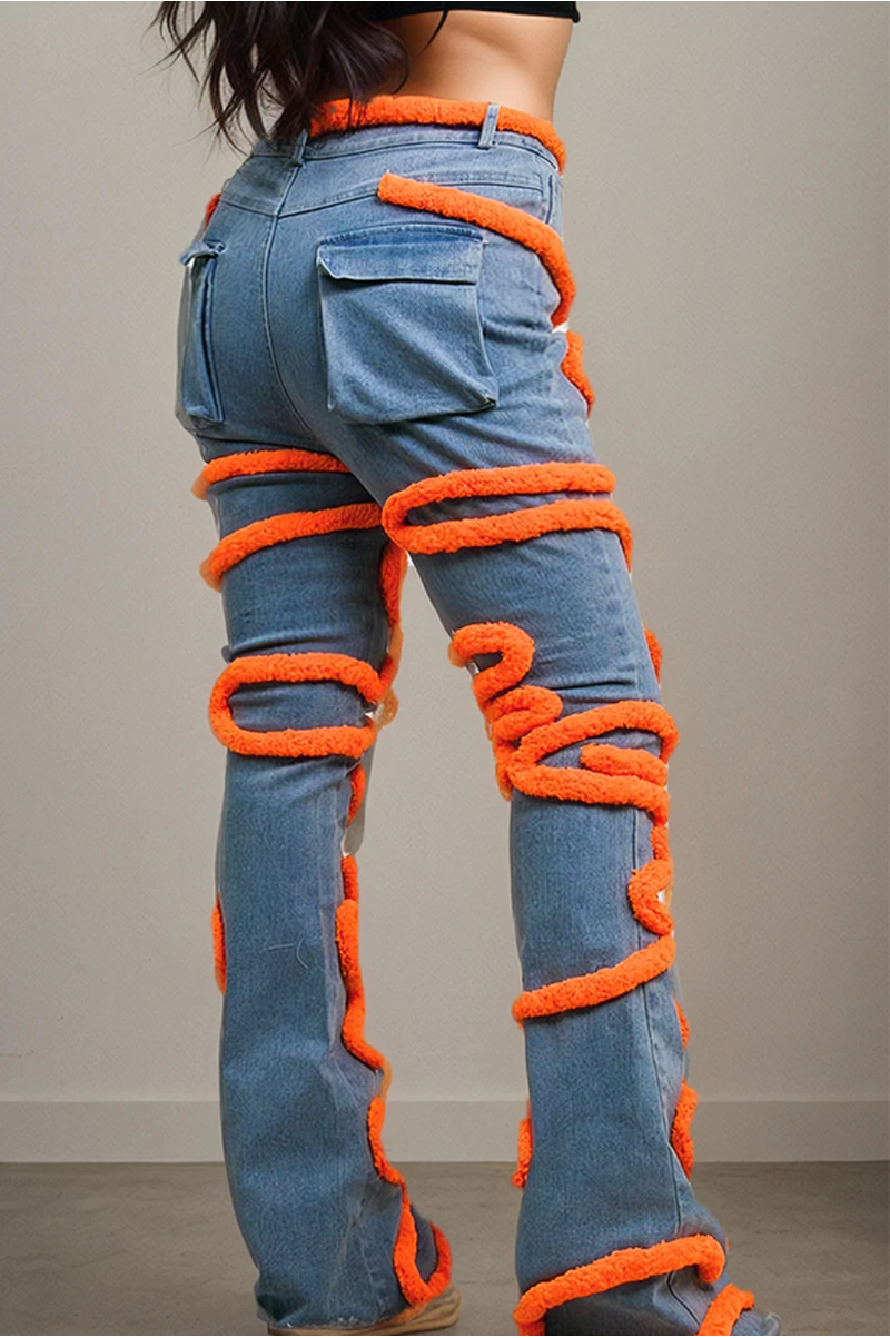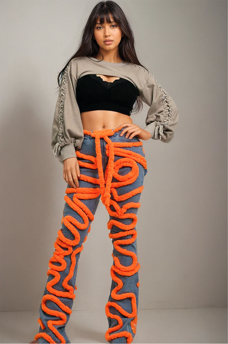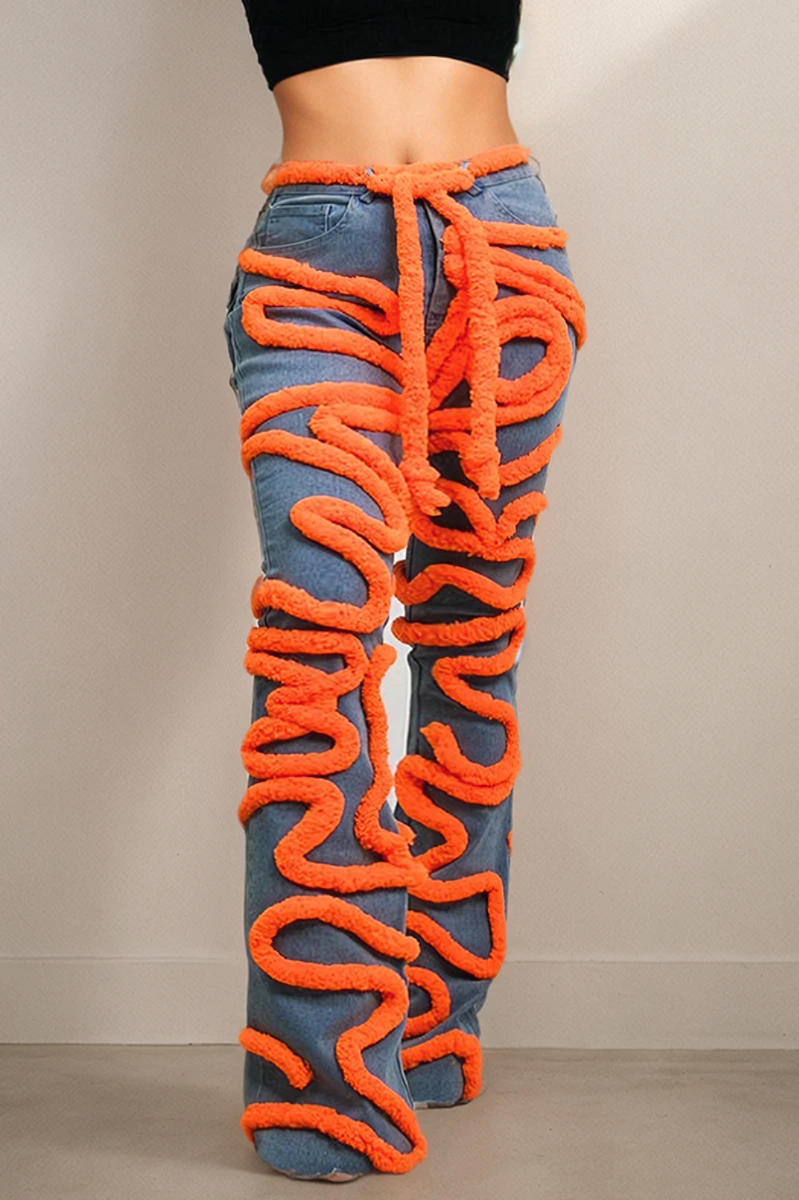Unleash your bold style with these eye-catching denim pants, a true statement piece for those who dare to stand out. Featuring a classic blue denim base, these pants are taken to the next level with vibrant orange piping that swirls around the legs in an organic, snaking pattern. The design not only adds a splash of color but also creates a sense of movement and an illusion of texture. The high waist cut ensures a flattering fit, while the slim silhouette tapers down to the ankles, highlighting the contours of your figure. Perfect for making a statement at casual outings or edgy enough for a night out, these pants are a versatile addition to any fashion-forward wardrobe. Pair with a simple top to let the pants shine or go bold with an equally daring piece for a full-on impactful ensemble.