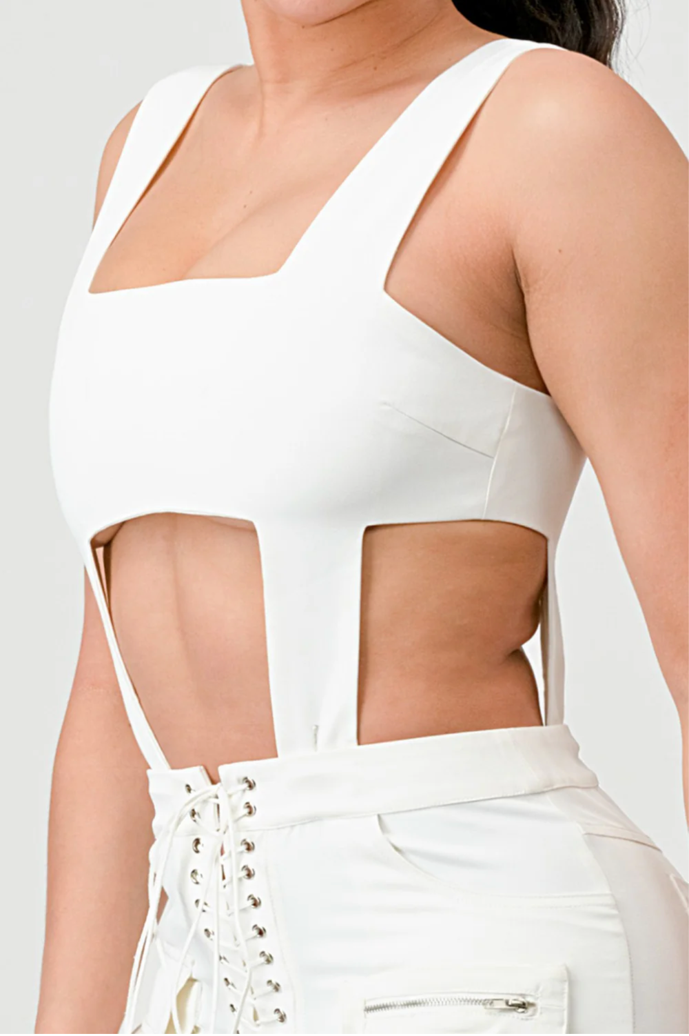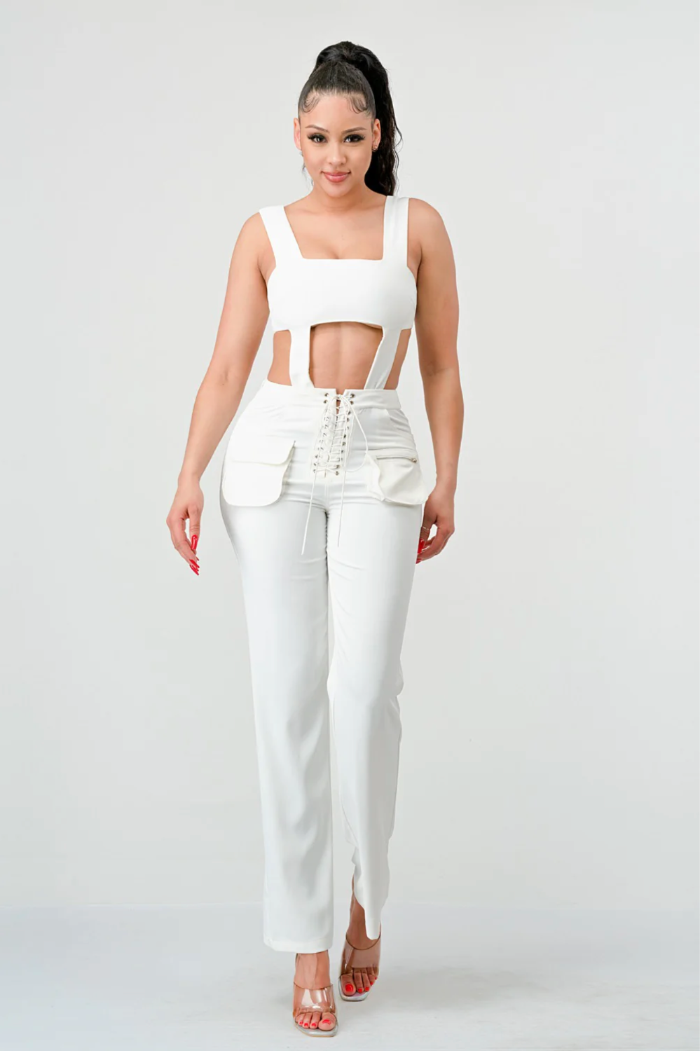 This stylish SEXY TANK & LACE UP FRONT PANT SET adds a unique and sophisticated touch to any wardrobe. The tank is sleeveless with a back zipper and the pants feature a lace-up front and pockets with cutouts. Crafted from polyester, this set offers a regular fit with a straight leg fit for all-day comfort. Accentuate your look with this chic set.